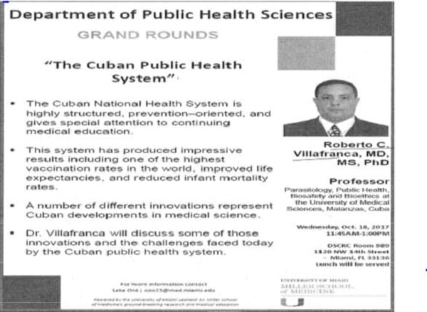 El próximo día 18 de este mes de octubre, en una colaboración con la Universidad de Ciencias Médicas de Matanzas,(no acordaron que esa colaboración no iba a suceder?) llega el militante del Partido comunista y profesor de esa entidad , el Dr. Roberto C Villafranca (invitado por el Dr. Frenk) para dar una conferencia en UM titulada “El Sistema de Salud Pública de Cuba”.