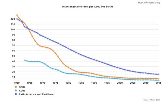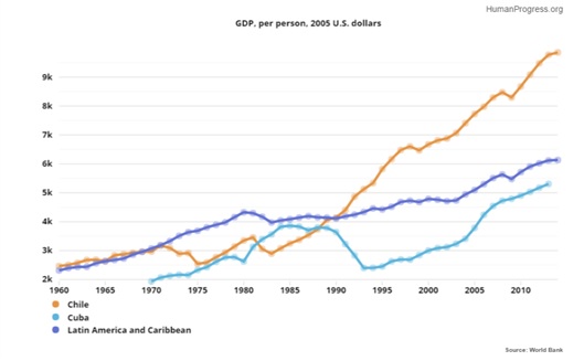 Between 1960 and 2015, life expectancy in Chile rose by 42 percent and in Latin America and the Caribbean by 34 percent. It rose in Cuba by 25 percent. If this is success, I wonder what failure looks like.