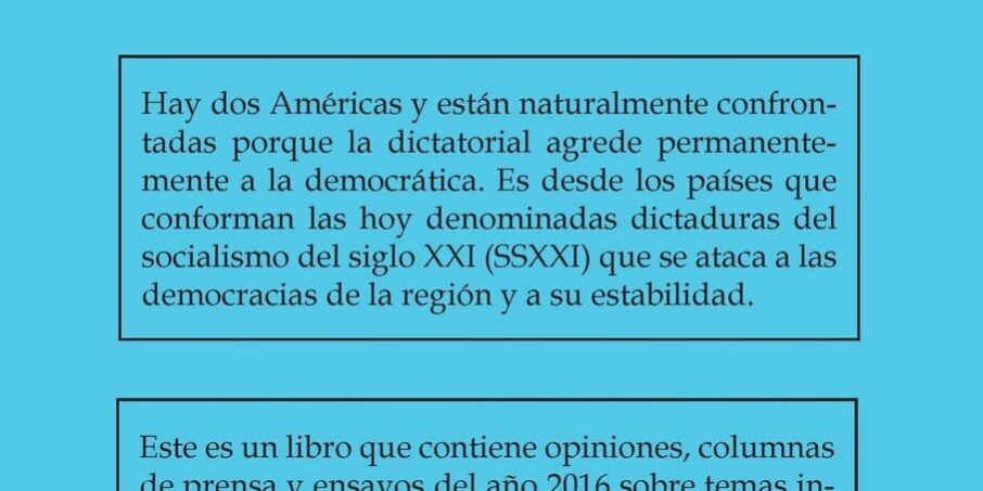 Hay dos Américas y están naturalmente confrontadas porque la dictatorial agrede permanentemente a la democrática. Es desde los países que conforman las hoy denominadas dictaduras del socialismo del siglo XXI (SSXXI) que se ataca a las democracias de la región y a su estabilidad. Este es un libro que contiene opiniones, columnas de prensa y ensayos del año 2016 sobre temas incómodos pero de lacerante realidad. Cada tema es un ensayo breve presentado en forma de artículo o columna de prensa. Son fotografías de instantes de la permanente disputa entre las dos Américas.